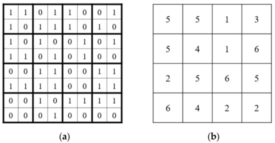 Assume that there is an image block with reconstruction values of 135 and 142, respectively, and Figure 3a shows the corresponding bitmap. Each bitmap of the sub-block can be replaced by a pattern number according to Figure 2, as shown in Figure 3b. Finally, the compression code of the block is ; the first 16 bits are binary reconstruction values, and the remaining 31 bits are bitmaps in the Huffman coded form.