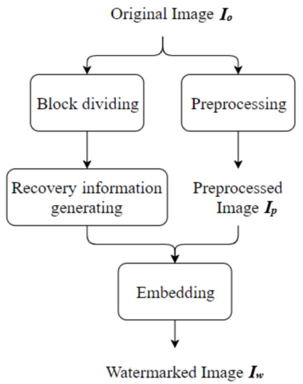 Before embedding the recovery information into the original gray-scale image Io sized with pixels, Io is divided into several non-overlapping blocks. Each block is sized as pixels and is denoted as BROIi, where i = (1, 2, …, ). A flowchart of watermark embedding is depicted in Figure 4. Details for generation of the recovery information and the watermarking embedding procedures are given in the following subsections.