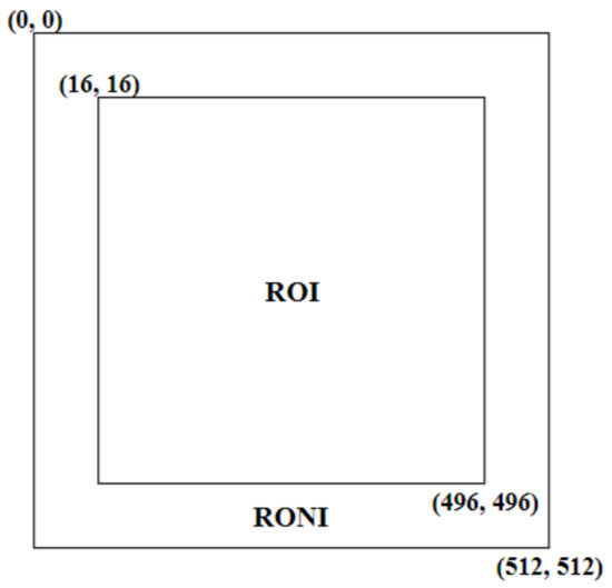 In order to generate recovery information (RI), two region types must be defined: a region of interest (ROI) and region of non-interest (RONI). ROI covers the crucial content of image Io; while RONI covers non-crucial image content. In our scheme, the size of the ROI region is 480 480, and only the ROI region can be recovered with our proposed scheme. In other words, the RI will only be generated from the ROI. Examples of ROI and RONI are demonstrated in Figure 5. Then, the HC-based AMBTC described in Section 2 is used to compute each non-overlapping block BROIi, BROIi, where i = (1, 2, …, ), from the preprocessed image Ip. Finally, each BROIi will generate recovery information with unfixed bits length RIi, where i = (1, 2, …, ), which contains 8-bits of high average value H, 8-bits of low average value L and an unfixed bits length pattern code.