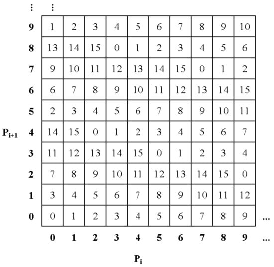 Once the RI for each non-overlapping block is generated, a reference matrix M as shown in Figure 6 is constructed according to Equation (9). This matrix acts as a reference table to embed recovery information RI into processed image Ip. Reference matrix M is sized as pixels, with a range of value , which is between 0 and 15. In other words, each value V in reference matrix M can be expressed in 4-bit binary and value is defined as Equation (7). An example of the partial content of reference matrix M is shown in Figure 6. In reference matrix M, Pi and Pi +1 represent a non-overlapped pixel pair in Ip. The embedding strategy is to find value V, which is close to the coordinate (Pi, Pi+1) and is the same as the decimal value of (4-bits RI) from reference matrix M.