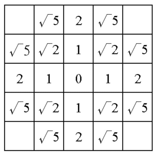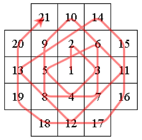 With reference matrix M defined in Figure 6, there are multiple coordinates which map to the decimal value of 4-bit RI values that range from 0 to 15. The found coordinate (Pi, Pi + 1) will be used to replace the original pixel pair. To make sure the found coordinate causes less distortion after replacement, the Euclidean distance between a given pixel and its neighboring pixel is considered as shown in Figure 7. Finally, the search path and replacement order that provides the minimal distortion can be found in Figure 8.