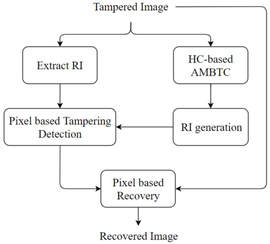 Assume that the watermarked image Iw has been tampered during transmission and the tampered image is denoted as It. First, the hidden 4 bits of each pixel pair of It can be extracted with the assistance of shared reference matrix M. Next, use the HC-based AMBTC for It to generate a new RI, then compare the new RI’ with the extracted RI. If the extracted 2-bit RIi from a single pixel is the same as the new one, this means the current pixel has not been tampered. Otherwise, it means that the current pixel pair has been attacked. Moreover, according to the recovery information extracted from undamaged pixel pairs, a pixel-based recovery mechanism is exploited to recover damaged pixels. A flowchart of tamper detection and recovery for the proposed scheme is given in Figure 9. Additionally, details regarding tampered pixel detection and recovery are presented in Section 3.2.1 and Section 3.2.2, respectively.