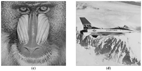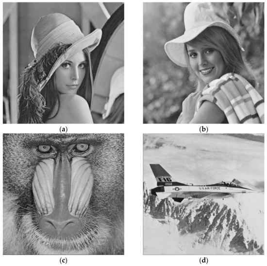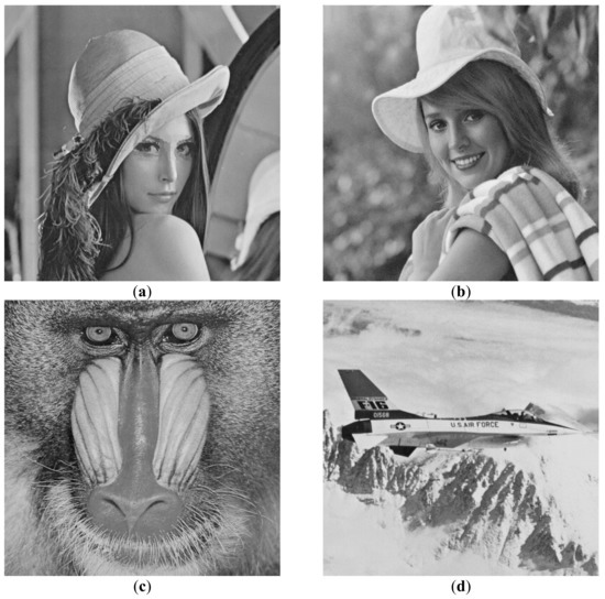 Four original grey-scale images: (a) Lena, (b) Elaine, (c) Baboon, and (d) Airplane.