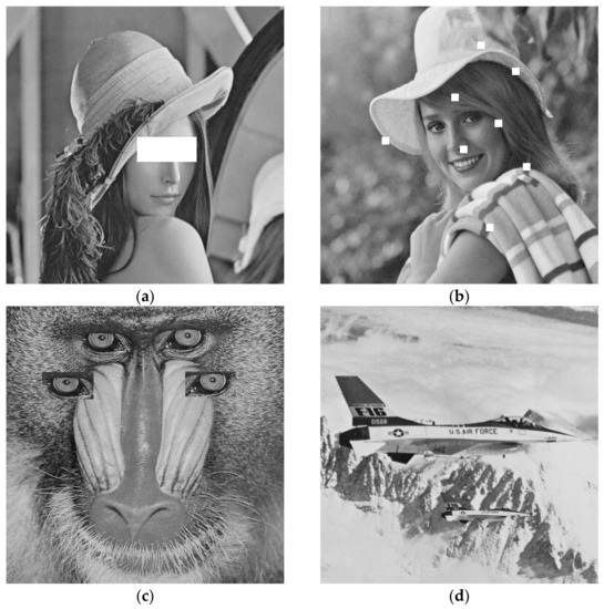 To prove the recovery performance of our proposed scheme, Figure 14 demonstrates the recovery results for four attacked images, with the PSNRs of their recovered images being, , , respectively. The average PSNR performance is . Moreover, from a visual point of view, the human visual system cannot distinguish the difference between these four reconstructed images and the original images shown in Figure 11.