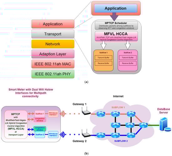 Here, we discuss the main flow of our algorithm. Figure 2a shows the IoT protocol stack with MPTCP as transport layer protocol. The system architecture is shown in Figure 2b. A smart meter with two Wi-Fi Halow interfaces is connected to a remote database server via multipath connectivity. The multipath flow is divided into two subflows. Two gateways from different ISPs are used for multipath connectivity. Our proposed congestion control algorithm maintains separate congestion windows for each subflow. The MFVL HCCA operates in the following two modes: