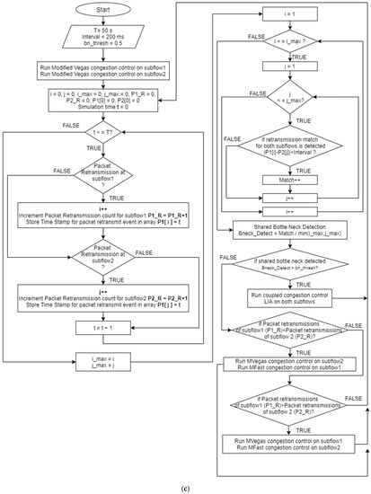 If shared bottleneck is not detected, then the numbers of packet retransmissions in both subflows are compared. The modified TCP Vegas congestion control algorithm is selected for subflow with more packet retransmissions and the modified Fast TCP congestion control algorithm is selected for subflow with less packet retransmissions. The algorithm then jumps to label “Again” and from t = 0 to t = T s the whole procedure is repeated again for the next cycle. The flow chart of the proposed algorithm is shown in Figure 2c.