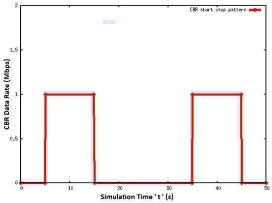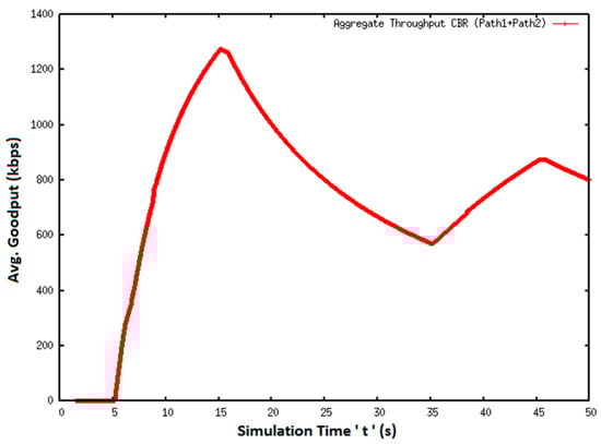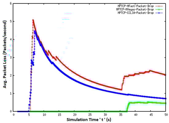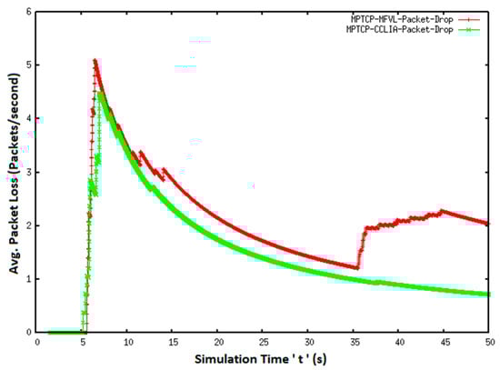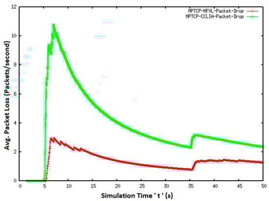 After observing the results of the first two experiments, we finalized the design of our proposed algorithm by deciding to use MVegas on subflow with more congested path and MFast on subflow with less congested path. The path congestion was detected by recording packet retransmissions for each subflow. We also implemented a shared bottleneck detection method in our algorithm. In real scenarios, the probability of a congested path shared by both subflows is very low and if a shared bottleneck is detected, then our algorithm switches to the standard coupled congestion control algorithm LIA. The simulations were run by using CBR data rate of 1 Mbps. The results show that MPTCP with our proposed model MFVL HCCA (MPTCP-MFVL) achieves higher throughput and less packet drop rate as compared with MPTCP with coupled congestion control LIA (MPTCP-CC-LIA). The results are shown in Figure 13 and Figure 14. To analyze the performance of our proposed model, here, we plotted the results for the time duration of simulation time t = 0 to t = T s (here, T = 50) when the algorithm has already selected MVegas for subflow with more congested path (Path 2) and MFast for subflow with less congested path (Path 1) after detecting path congestion by calculating packet retransmissions for each subflow. Now, for this time duration, the packet retransmissions are calculated again for each subflow to take decisions for the next cycle.