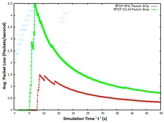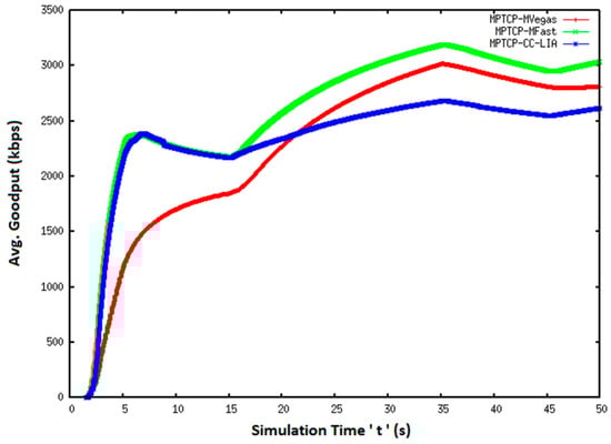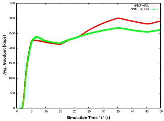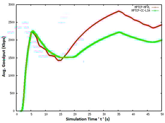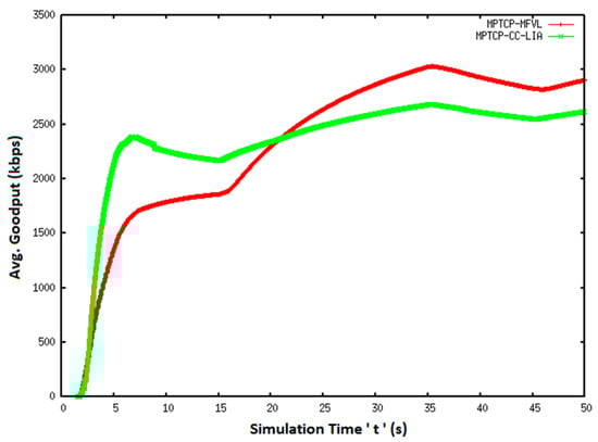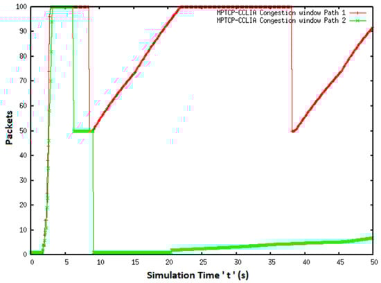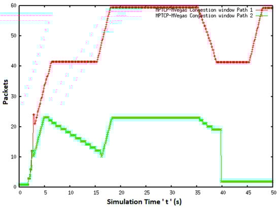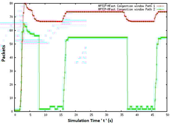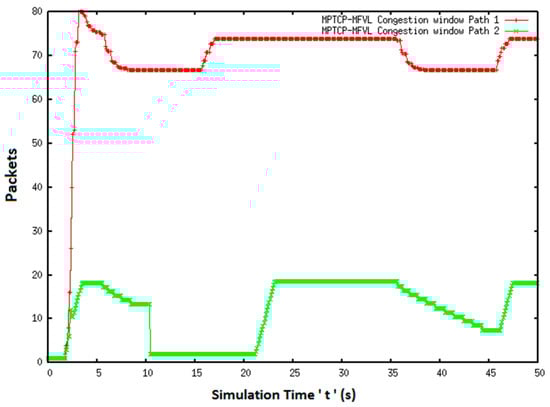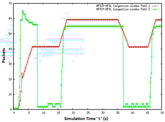 The congestion window plots of our proposed model, MPTCP-MFVL, are also shown in Figure 16. MVegas is used to control congestion window of subflow with more congested path (Path 2) and MFast is used to control congestion window of subflow on less congested path (Path 1), thus, inceasing the aggregate goodput of both subflows and decreasing aggregate packet loss rate as compared with MPTCP-CC-LIA.