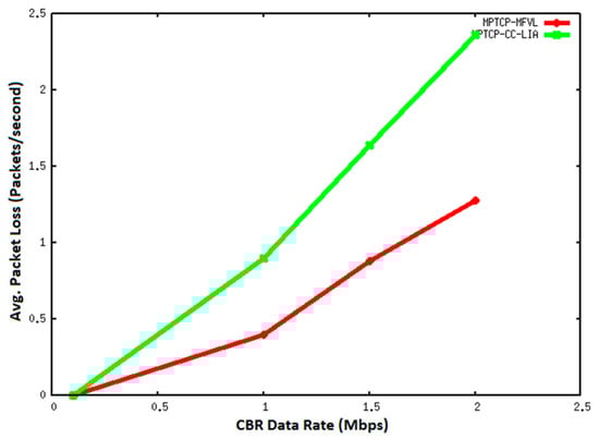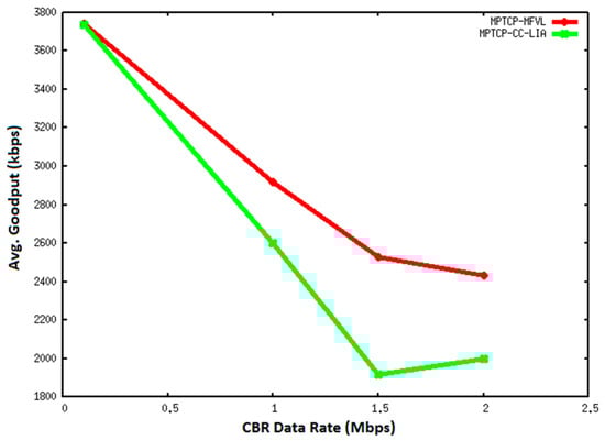 In our final experiment, the CBR data rate was varied from 0.1 Mbps to 2 Mbps and the results were plotted. The average goodput and average packet drop rate with CBR 2 Mbps are shown in Figure 17 and Figure 18 respectively. For different values of CBR ranging from 0.1 Mbps to 2 Mbps, the average goodput and packet drop rate are plotted in Figure 19 and Figure 20 respectively. The results show that our proposed model MPTC-MFVL can achieve up to 30% higher average goodput and decrease average packet loss up to 50% than standard multipath TCP with coupled congestion control MPTCP-CC-LIA. Hence, in uncoupled mode, our algorithm has successfully achieved the goal of increasing goodput, decreasing packet drop, balanced congestion, and less aggressive increase of congestion windows show its harmless behavior to other TCP flows. To achieve the goal of fairness in the case of shared bottleneck, we propose to use MPTC-CC-LIA in coupled mode for our algorithm only after detecting shared bottleneck link. The simulation results are not shown for coupled mode as we used only the existing algorithms without any modifications.