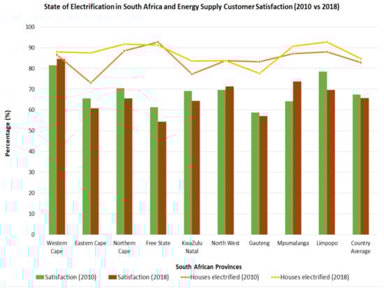South Africa electrification status and overall customer satisfaction (generated from data presented in the South African Census report [,]).