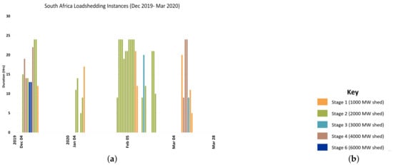 Loadshedding incidents from December 2019 to March 2020 (graph generated from data collated from public announcements issued by the national energy provider, Eskom). (a) Outages from December 2019 to March 2020; (b) Key for implemented loadshedding stages.