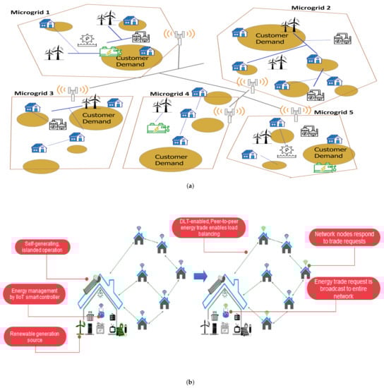 The distributed ledger technologies (DLT)-enabled microgrid community. (a) Proposed microgrid architecture for rural network deployments []; (b) Operation of the DLT-IIoT microgrid can be broken into two main stages: isolated, self generation and DLT-enabled energy trading (adapted from [], ©2020 IEEE).