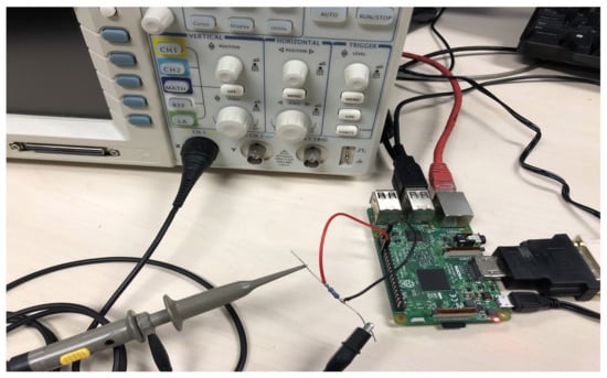 To evaluate the performance, a simple smart contract was deployed. According to the contract specifications, the Raspberry Pi node was to transmit ‘send’ transactions into the network over a set period of time by transferring one ether to the wallet address of the miner node. For this set of experiments, 1 and 2 min intervals were selected as the total time period in deference to the overheating potential of the Pi’s processor. The time between the smart contract calls was adjusted in various rounds to test a variety of time intervals that cover normal edge node operations in a wake/sleep pattern (transaction send every 10 s) and real time edge node operation (transaction send every 1 ms). To determine the execution time and power consumption associated with the Ethereum transaction, a GPIO pin toggling method was implemented within the contract in addition to the transaction methods. Starting with the pin in a LOW state, at the start of each ‘send’ transaction the pin was pulled into a HIGH state. Once the transaction had completed, identified by a decrease in the wallet balance, the GPIO pin was pulled back to its starting LOW position. The initialised GPIO pin was connected to a Rigol DS1102D oscilloscope across a resistor to measure the width time and voltage amplitude of the resultant square waveform. Figure 5 gives an illustration of the setup for the Raspberry Pi and oscilloscope with the resultant waveform shown in Figure 6b.