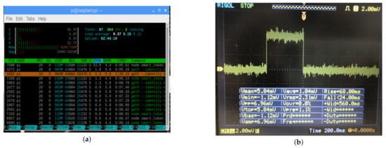 Performance testing experiment captures. (a) Htop capture of CPU and RAM memory consumption; (b) Execution time and voltage drop waveform for Ethereum transaction.