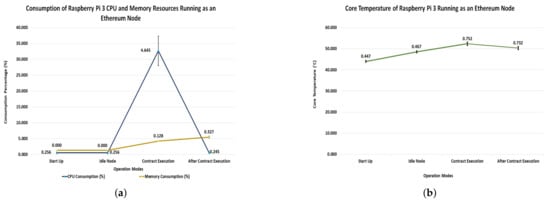 Over the course of the experiment, a general increase in the core temperature of the Raspberry was observed. Considering Figure 7b, one can see that the node in an idle state experienced an increase of 4.583 C in the average temperature when compared to the average start up temperature of 44.000 C. Contract execution lead to an 8.353 C increase, as compared to Startup, with the temperature decreasing by 2.053 C once the contract had concluded execution. Between the Idle Node state and the Contract Execution state, the Raspberry Pi experienced a 3.770 C increase in temperature. While the increases in temperatures observed were significant, it was noted that the maximum recorded temperature of 53.800 C for Contract Execution was still well below the recommended maximum operating temperature of 80 C for the Raspberry Pi.