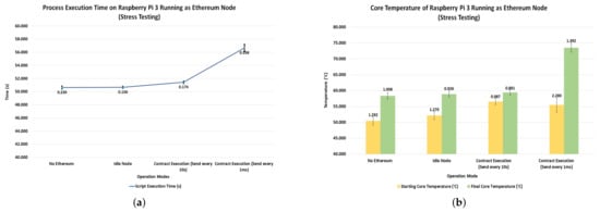Stress testing results of Raspberry Pi Ethereum node: (a) Concurrently running Python script execution time. (b) Core temperature of Raspberry Pi node under stress test.