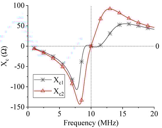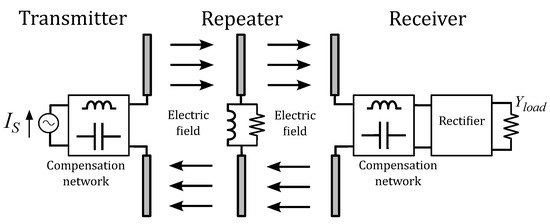 Note that this does not represent the physical structure of the coupled CPT plates, but an equivalent representation thereof [26,27]. Analogously, the electric coupling between the receiver and the field repeater is symbolized by , and mutual capacitance . The corresponding coupling factor is given by: