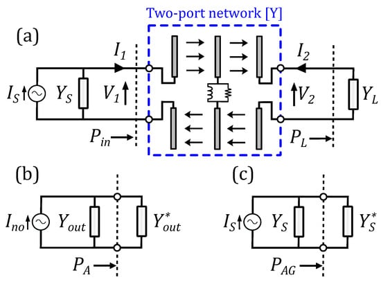 To determine the gain functions, it is useful to derive the Norton equivalent circuit of the two-port loaded with (Figure 2b) [24]. The output admittance when is open-circuited is given by and can be derived from and (1):
