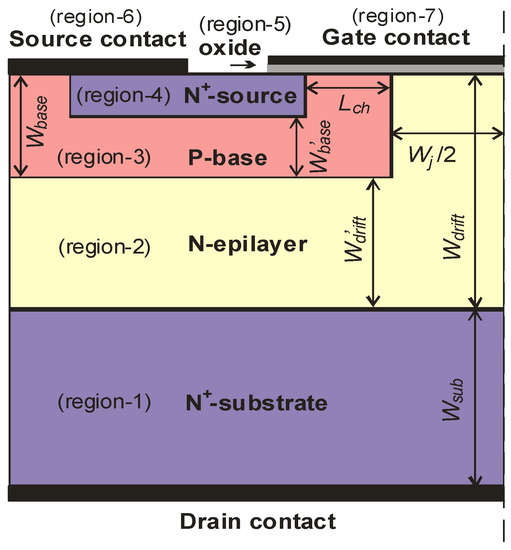 Seven regions can be identified as follows. The drain is a heavily nitrogen-doped N+-region (region 1) that coincides with the 4H-SiC substrate on which the drift layer (region 2) is grown by epitaxy. Region 3 is the aluminum-doped p-base where the MOS structure and the conductive channel under the gate oxide lie. Region 4 is the phosphorous-doped source region. Region 5 is the insulating SiO2. Finally, region 6 and region 7 form the source and the gate contacts, respectively. Note that the source contact shorts the source and base regions to prevent the switch-on of the parasitic substrate(N+)-epilayer(N)-base(P)–source(N+) bipolar junction transistor.
