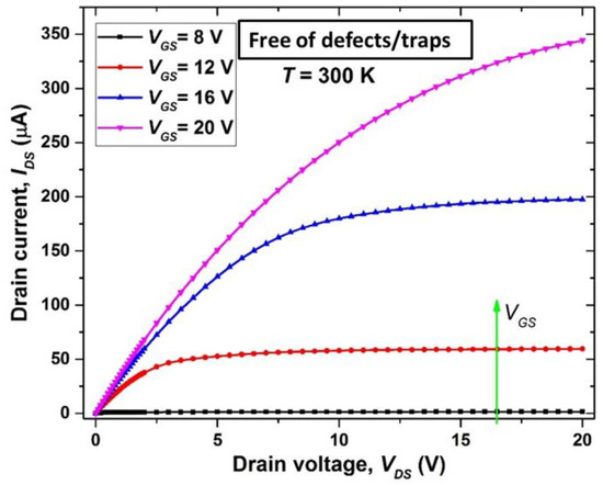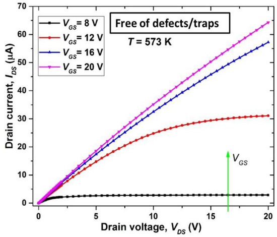 The simulation analysis starts considering the 4H-SiC MOSFET described in Table 1 as a device free of intrinsic defects and interface traps (fresh device). The drain current (IDS)-drain voltage (VDS) output characteristics nearby and within the triode region of this device for 8 ≤ VGS ≤ 20 V are shown in Figure 2 (T = 300 K) and Figure 3 (T = 573 K). The value VGS = 8 V can be roughly assumed close to the effective MOSFET threshold voltage.