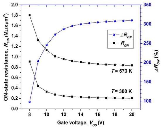The calculated behaviors of RON as a function of VGS are shown in Figure 4. Here, the percentage variation with temperature (ΔRON) is also reported. In particular, ΔRON quickly tends to stabilize around 300%. As expected, an increasing value of T determines a change in the charge density both in the inversion and in the depletion region with a severe impact on the RON curve.