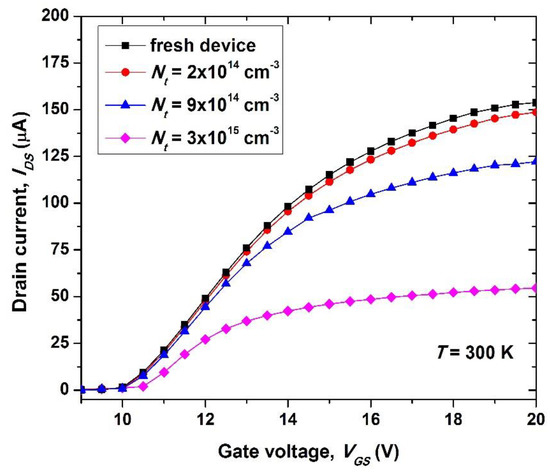The main reason of the results in Figure 5 lies in the penalized flow of electrons due to the defect effects which originate in the MOSFET drift region increasing the local recombination rate. In other words, the drain current is degraded because these defects reduce the carrier lifetime and act as carrier traps in the device active region introducing high-resistive paths. The weight of the term Nt in penalizing the device current-voltage characteristics is almost the same for different temperatures when the MOSFET is firmly in ON-state. For example, in the 300–573 K temperature range, with respect to the fresh device, we can calculate always an IDS reduction on the order of 5% and 20% for Nt = 2 × 1014 cm−3 and Nt = 9 × 1014 cm−3, respectively.