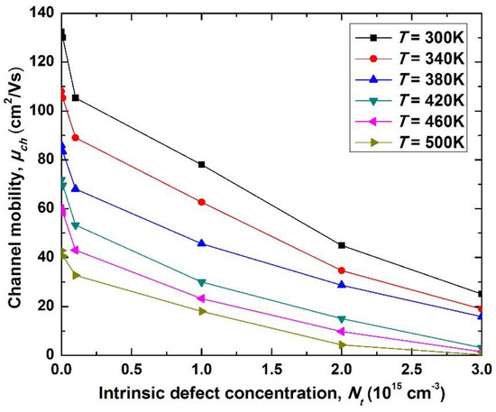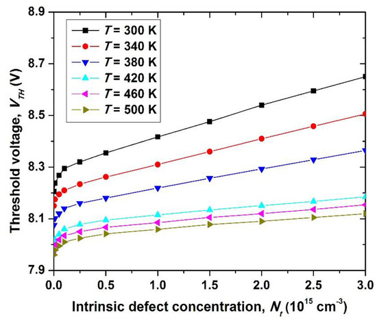 On the contrary, the presence of 4H-SiC intrinsic defects affects the MOSFET threshold voltage variation with temperature differently. In fact, as shown in Figure 6, while VTH tends to increase with increasing Nt for a fixed temperature, this effect tends to become less prominent at the higher values of T (>400 K). In Figure 6, VTH is always calculated by imposing a subthreshold drain current in the limit of 10 nA.