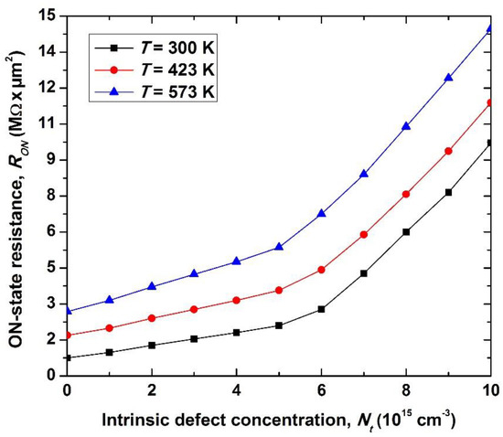 The presence of 4H-SiC intrinsic defects increases RON considerably with an almost similar behavior in dependence of T. This result is more noticeable the closer Nt approaches (overcomes) the epilayer doping concentration (5 × 1015 cm−3). In fact, these defects act as efficient recombination centers both in the channel region and in the drift region causing higher resistive paths for the current flow. In particular, in a physical device, Z1/2 centers with their negative-U nature (i.e., the Z1 and Z2 energy levels are very close to each other) can be considered able to capture couples of electrons almost simultaneously. At the same time, the positively charged EH6/7 defects (when empty), with their larger cross sections for electrons, are deeply involved in the detrimental effects in the channel region of an n-type MOSFET.