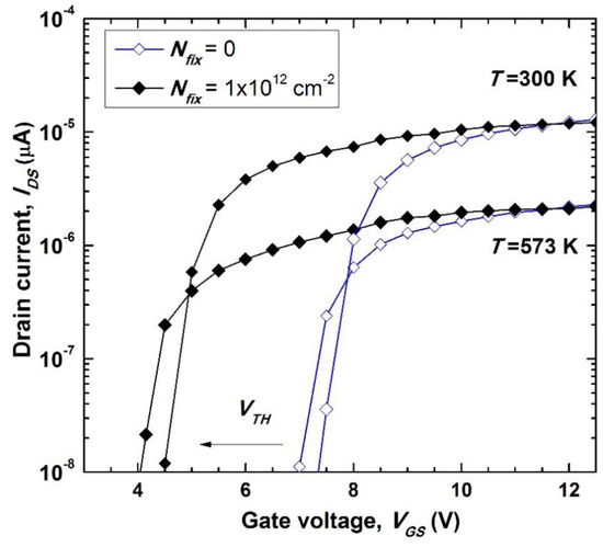 After fixing Nt = 2 × 1014 cm−3, in order to refer the MOSFET analysis to a more realistic device, in the successive simulations the trap effects at the 4H-SiC/SiO2 interface have been accounted for. As expected, these interface traps heavily affect the device performance by degrading the channel mobility and increasing the channel resistance contribution further. In a first step, we have investigated the role of the fixed oxide traps by assuming, in accordance with experimental data [41,42,43], a reference value Nfix = 1 × 1012 cm−2 into a thin film of SiO2 located at the 4H-SiC interface. These centers, which number can be assumed independent from T, are positive charges responsible for the semiconductor band-bending at the interface [57,58]. The band-bending effect sustains the formation of the conductive channel for lower values of VGS and therefore tends to reduce the MOSFET threshold voltage as shown in Figure 9.
