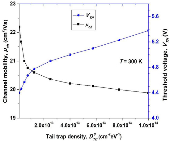 When increasing the tail traps, they are able to trap an increasing number of electrons in the near-threshold regime of the device, preventing the complete channel formation and thus determining a positive shift of VTH similarly to the intrinsic defect concentration effect. At the same time, the increased number of filled tail traps increasingly enhances the scattering phenomena of mobile charges in the inversion layer for VGS > VTH. For example, we can expect a channel mobility which is about 20 cm2/Vs for VGS = 12 V and VDS = 1 V. In particular, a tail trap density up to 1 × 1013 cm−2 eV−1 leads to a faster variation of the µch and VTH curves. From the literature, a D0TC value close to 1 × 1013 cm−2 eV−1 was extracted experimentally in [41]. However, other experimental works dealt with a tail trap density of about 6 × 1013 cm−2 eV−1 [42,43]. Obviously, the exact value is strictly dependent on the available technology and device fabrication process.