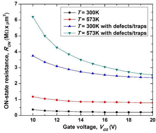 In sum, the observed results in Figure 11 depend on both the occupied density of states and temperature. In particular, the fresh device presents a RON curve with a positive temperature coefficient that is almost constant in the whole explored VGS range (i.e., ΔRON ≈ 300% @T = 573 K) whereas a MOSFET structure involving intrinsic defects and an explicit DoS at the gate oxide interface presents a decreasing ΔRON in dependence of VGS. Obviously, the presence of defects and traps leads the MOSFET to operate with a lower drain current at any fixed bias voltage and temperature. As an additional result note that, with respect to the curves in Figure 11, by reducing the trapped charge density by a factor of 10 we have calculated an RON improvement on the order of 15% preserving about the same ΔRON. This improvement is certainly due to an increased inversion charge and an enhanced channel mobility.
