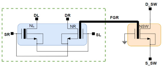 NR and NSW transistors share a common floating gate (FGR), which enables the switch transistor programming to be performed by the NR transistor. The purpose of the NL transistor is to provide a means for differentially reading the memory cell [20,21].