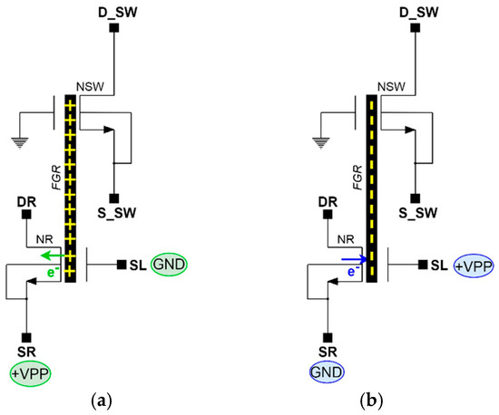 In order to remove the electrons from the FGR (Figure 2a), a positive high-voltage programming pulse (+VPP) is applied to the NR transistor source (SR), while its control gate (SL) is kept to ground. In this way, the FGR potential becomes positive, causing the switch transistor to turn on and allow the current to flow between its drain and source. This is called the on-programming procedure.