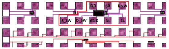 NSW was switched off by programming. Thus, a voltage step of 0 to 18 V was applied to the SL pad. SR was grounded while the DNW pad was connected to 18 V. The current measured through NSW after applying this programming sequence on NR was of max. 5 nA, confirming the switch’s off state.