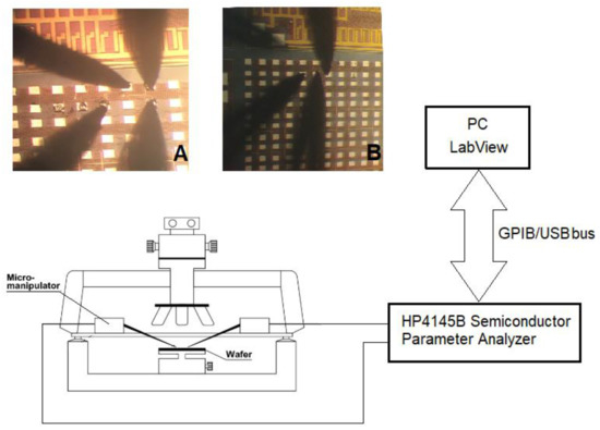 Figure 4 illustrates the measurement setup used for testing the functionality of the nonvolatile switch on the wafer. It included a micromanipulator for placing the four available needle probes onto the desired pads, a semiconductor parameter analyzer (HP4145B) responsible for biasing and measurements, and a PC for data processing.