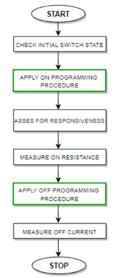 Two configurations (Figure 4A,B) were employed during the measurements. In configuration A, the four needle probes were connected on the SL, SR, DNW, and GND pads to enable the programming procedure. In configuration B, three needle probes were connected on the S_SW, D_SW, and GND pads in order to determine the effects of programming on the switch state. The measurement method followed the steps indicated in the diagram shown in Figure 5.