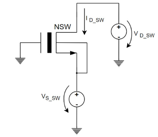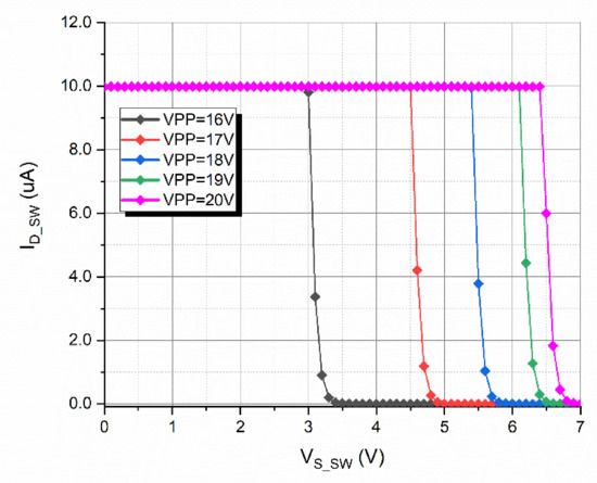 Then, in order to program the nonvolatile switch in the on state, a step voltage varying from 0 V to a variable high voltage level (VPP between 16 and 20 V) was set for the SL pad. The same VPP was applied to the DNW pad, while SR was grounded. For each case, the responsiveness of the FGR potential was assessed using the setup in Figure 6. The VS_SW source was varied between 0 and 7 V, while VD_SW was kept constant at 7 V.