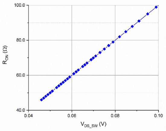 The on-resistance of the switch varies with the overdrive voltage variation. Because the sourced current through the drain is constant, the RON variation also causes the drain voltage to change. For VDS_SW values below 0.1 V, the RON is situated between 45 and 100 Ω, as shown in Figure 9. As expected, the relationship between the on-resistance and the switch drain-to-source voltage is linear.