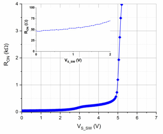 Figure 10 shows NSW on-resistance variation with VS_SW. At high overdrive voltages, the on-resistance has low values, varying from 45 to 70 Ω for VS_SW under 2 V (see inset of Figure 10). This small variation makes this switch ideal for low-voltage applications. A “knee” shape can be observed in Figure 10 when VS_SW is around 3 V. This effect was observed on all measured structures. After the source voltage reaches 5 V, the on-resistance abruptly increases in response to the fact that the transistor starts to turn off (VFGR − VS_SW ≤ VT).