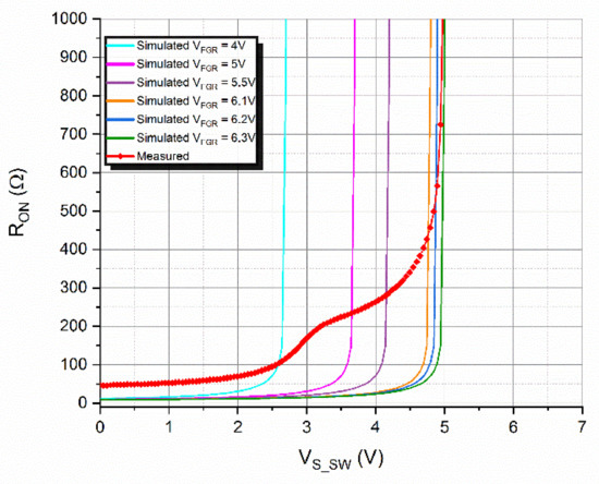 Simulations were also performed on the nonvolatile switch considering multiple values for the floating-gate voltage in order to estimate the real FGR value at VPP = 18 V. The simulated results are plotted in Figure 11, together with the measured characteristics presented in Figure 10. Matching was sought in the portion of the curves where RON exhibited an abrupt increase, corresponding to the transition between on and off states. Thus, the real value for the FGR potential was estimated at around 6.2 V. The measured on-resistance variation is larger than its simulated counterpart for a VS_SW lower than 5 V.