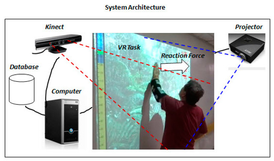 For the VRISR, seven situated VR tasks, based on three categories of rehabilitation movements: forearm extension, shoulder-elbow exercise, shoulder joint internal/external rotation, were constructed via game-developing software Unity 3D. Microsoft Kinect was employed to detect user movements and collate data of the upper limb bones to monitor the location of users’ hands. Patients were able to instantly control the target objects to achieve the task goals. The VR tasks equipped with multiple sensory feedback designs and hierarchical challenges. Scene of virtual environment was projected onto a wall. Users stood facing the wall with their arms stretched upward resting on the wall, which provided a reaction force; this is known as passive haptics. Task performance and motor trajectories were recorded in a database for subsequent motor analysis. The system architecture is presented in Figure 1.