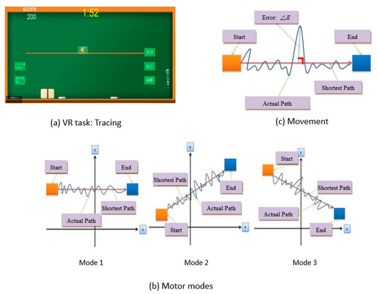The Tracing task was selected from the various forearm extension training exercises for developing and analyzing relevant motor indices, as shown in Figure 2a. Patients were required to use the hand of the affected side to connect target objects on the left of the screen with objects on the right by following the paths presented on screen. The paths from left to right could be horizontal lines or oblique lines from the upper left side to the lower right side and from the lower left side to the upper right side. The purpose of this design was to enable patients diagnosed with frozen shoulder to slowly stretch and extend their injured shoulder joint. The tracing task was divided into 3 motor modes, as shown in Figure 2b.