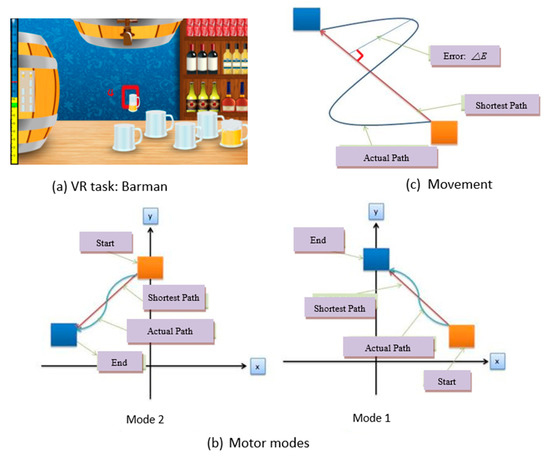 For shoulder-elbow exercise, the Barman VR task was selected for developing and analyzing relevant motor indices, as shown in Figure 3a. For this task, the patients controlled the hands of a bartender in a virtual scene to perform tasks such as obtaining glasses from the bar, pouring drinks into the glasses, and then presenting the glasses filled with drinks. Before performing this task, the patients were instructed to stretch their injured shoulder joint for ten seconds by placing their hands on a white wall. The movements involved in the Barman task were divided into two motor modes, as shown in Figure 3b. Mode 1 involved collecting empty glasses from the lower right of the screen, moving them to the center of the screen, and then filling them with drinks. Mode 2 involved moving the filled glasses to the lower left of the screen.