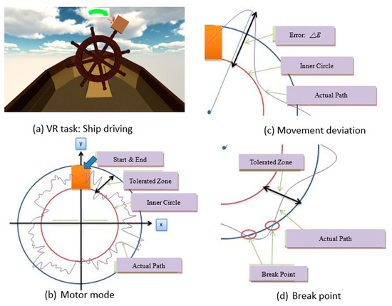 The following five motor indices were adopted for the ship driving task: (1) EF, which refers to the ratio of the actual motor trajectory length to the circumference of the inner circle in the target area. The closer the ratio is to one, the higher the efficiency. (2) Rotational velocity (RV), which was determined by dividing the rotational angle of the patients’ shoulder joint during the task by the amount of time spent completing the task. Because the degree to complete a circle is identical 360°, the less time spent, the higher the RV. (3) The ωmax, which was determined according to the instantaneous angular velocity of the patients’ arm movements. A low ωmax value indicates high stability, which reduces the likelihood of overshooting. (4) MD, which was calculated based on the entire time-history root-mean-square error of all deviations from the target paths during the training tasks, as shown in Figure 4c. The error was determined according to the distance between the patients’ hand projections and the circumference of the inner circle. Comparatively low MD indicates high stability and controllability. (5) Break point (BP): If the patient’s affected arms lack stability and moves out of the tolerated zone, the VR helm will cease to turn, which is considered one BP, as shown in Figure 4d. A low number of BPs indicates high stability.