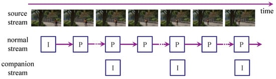 Different than the SI/SP picture strategy, all of the following techniques are based on the observation that it is more important to have a fast visual feedback on a channel change request, than the full quality immediately after tune-in [22]. To accommodate this, two video streams work together to provide random access and packet loss recovery. Similar to the proposed technique, one stream provides a high-quality representation with minimal keyframes (normal stream) and the other provides a large amount of keyframes (companion stream) to accommodate fast channel change and recovery [4,5]. Channel changes or loss recoveries then happen by borrowing a keyframe from the companion stream and inserting it in the normal stream. Similar principles have been applied for Gradual Decoder Refresh (GDR) or intra refresh coding such that the companion stream fills up missing I-slice information [23]. Additionally, others propose to include a picture-in-picture channel in the stream. This channel has a lower bit rate (and resolution) than the regular channel, but it is constructed with a small GOP size [24]. For the reader’s reference, in previous works, the normal stream [5,25] has also been named the main stream [4]. The companion stream [26] is known in other works as the synchronization stream [4], the channel change stream [5], or the fast channel change stream [25].