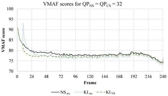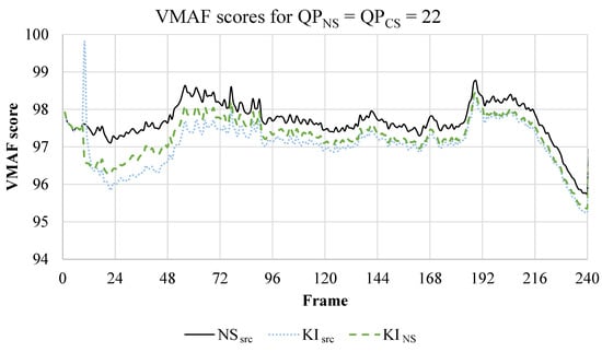 First, the quality is evaluated in-depth on a single sequence. That is, Figure 4 shows the VMAF scores of the ParkScene-sequence, for NSsrc, and for KIsrc, and KINS. The videos are encoded with . As the keyframe is inserted at the 10th frame, the VMAF scores are equal in the first 9 frames.