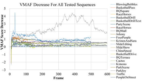 Although the average VMAF, PSNR, and SSIM decreases remain relatively small, it is important to carefully monitor the worst-case quality decrease in a single frame of a single tested sequence as well. As the keyframe insertion introduces errors that can drift uncontrollably, the worst-case results may expose obtrusive artefacts. For example, Figure 6 shows the VMAF decrease of KIsrc compared to NSsrc, for all sequences, with . Although the VMAF decrease of most tested sequences stabilize between 0 and 1 VMAF point, the BQSquare-sequence has a VMAF decrease of up to 4.3 VMAF points. This worst-case sequence is discussed more thoroughly in Section 4.4.