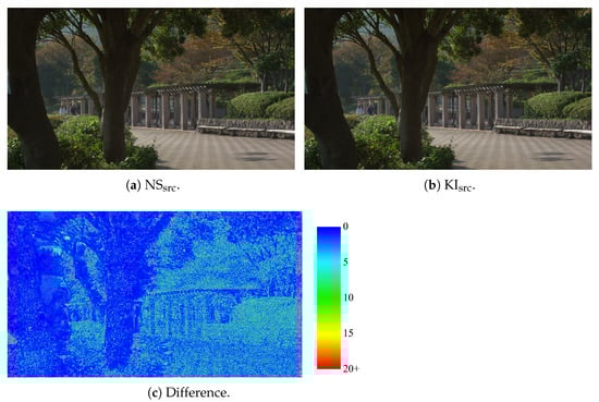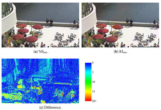 Frames of the ParkScene-sequence with . (a) The frame of NSsrc without drift-error artifacts. (b) The frame of KIsrc with drift-error artifacts. (c) The differences between subfigures (a,b). It is recommended to view these images in color, digitally.
