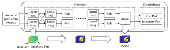 - In the first step, the initial contrasts are divided into the real part and the imaginary part as the input of the generator. And then both parts are convolved with the corresponding filters according to Equation (10) to obtain a set of feature matrices. Note that the output of cCNN has the same size as its input. In other words, the size of the feature matrix remains constant in entire training process.