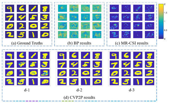 Figure 3a shows the ground truths of the simulated MNIST handwritten digits for the nonlinear inverse problem. Figure 3b,c show the image obtained by BP and the MR-CSI with 1000 iterations, respectively. This is a clear indication that neither BP nor MR-CSI can provide acceptable results in high contrast cases. The corresponding results that calculated by CVP2P with cCNNs of 3, 6, and 9 layers are shown in Figure 3d(d-1,d-2,d-3), respectively. The results illustrate that more parts of the nonlinear features in inverse scattering problem can be learned by CVP2P.